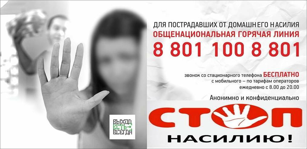 - "Горячая линия" для пострадавших от домашнего насилия: 8-801-100-8-801 (ежедневно с 8.00 до 20.00).