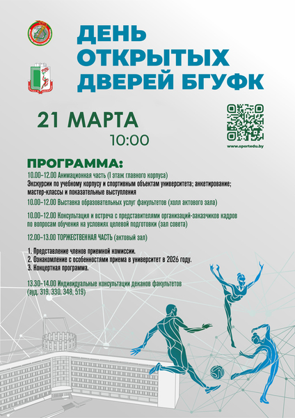 Белорусский государственный университет физической культуры приглашает абитуриентов, родителей, всех заинтересованных на День открытых дверей для получения информации об образовательных возможностях университета, правилах приема, особенностях поступления, условиях обучения и последующего трудоустройства.